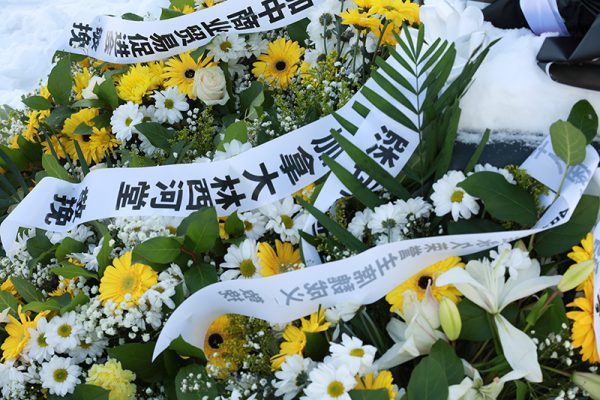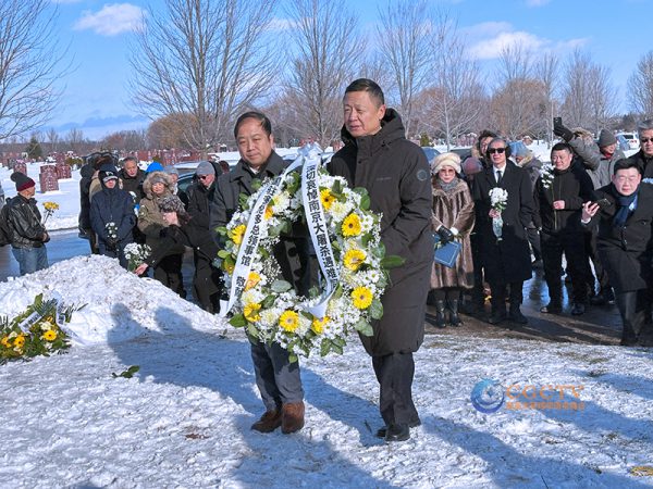 随后,多伦多华人团体联合总会朱燕主席、 周捷秘书长,中华人民共和国驻多伦多总领事罗伟东、张超峰领事和加拿大三级政府的议员们到纪念碑前敬献花圈并三鞠躬。