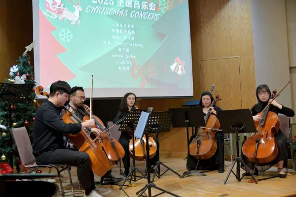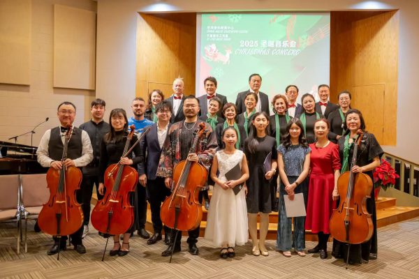 音乐会的一大亮点是贺子潇博士为纪念二战胜利80周年编配的大提琴五重奏《辛德勒的名单》,此次也是该曲的首演。第一大提琴由毕业于多大音乐学院及耶鲁大学音乐学院的青年演奏家 Christopher Hwang 担纲,贺子潇、Antonia Cambre、钞艺萍与Nicole Wei 分别担任第二至第五大提琴。这首最新编配的大提琴五重奏,只经过演出前短暂的排练,但演奏家们展现出了精湛的技艺及高度的默契度,首演即触动了人们的心灵。这部作品在约翰·威廉姆斯为电影《辛德勒的名单》配乐的经典旋律基础上,通过五把大提琴不同音区的对话与交融,构建出低音庄重、中音温暖、高音凄美的立体音响空间,赋予这首名曲新的艺术维度与思维厚度。在当今动荡的国际局势下,这段跨越时空的旋律不仅是一次音乐的再现,更成为抚慰心灵、呼唤和平的深刻表达。