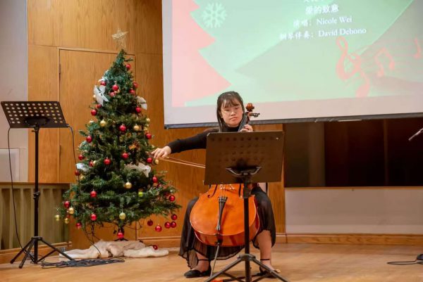 音乐会上演唱的男声曲目还有Frank Hou的《教我如何不想他》、Ken Zhang的《Caro mio ben》(意大利艺术歌曲—我亲爱的)、薛思丹的《锦瑟》、霍文翔的《天边》,女声曲目则包括高晓琼的《红豆词》、艾翎的《橄榄树》、王舒的《女儿情》、李路的《友谊地久天长》,他们学习声乐的时间有长有短,个人条件也不尽相同,但都不存在音准方面的问题,这又一次验证了视唱练耳对声乐学习的重要性。器乐节目还包括Patrick Wang、牛菁菁和Nicole Wei的大提琴独奏,他们的演奏也受到大家的好评,这也是钞、贺两位老师“声乐与器乐共融”教学理念成果的体现。