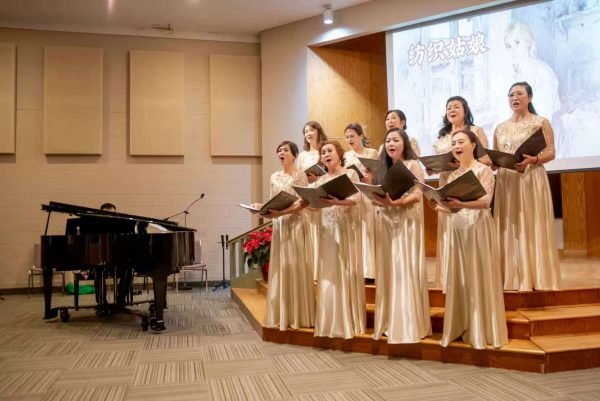 两首女声小合唱及三首混声合唱也展示了极高的水准。合唱队员每个人都有独唱节目,他们克服了时间紧、任务重等困难,只经过有限的排练即高质量地完成了这几首合唱,在音色、声部平衡、节奏、表现力等诸方面都发挥了较高的水准,这和钞艺萍老师坚持声乐与视唱练耳并重的教学理念密不可分。更值得一提的是《望月》声部的编配由贺子潇博士倾心完成,受到中加两国业内人士的首肯,被誉为“增强了这首歌曲的内涵与艺术感染力”。