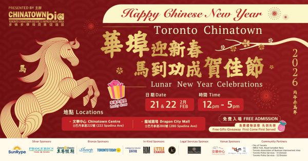 由多伦多華埠商业促进区 (CBIA) 主办,一年一度农历年新春活动,「2026 多倫多華埠農曆新年慶祝活動」將於 2026 年 2 月 21 日(星期六)及 2 月 22 日(星期日)隆重舉行。活動地點設於文華中心(222 Spadina Ave)及 龍城商場(280 Spadina Ave),誠邀社區居民及遊客共襄盛舉,一同迎接農曆馬年的到來。