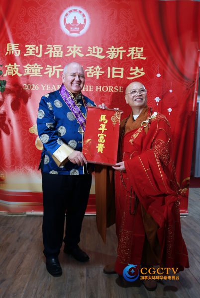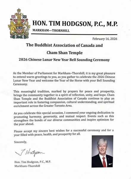 国会议员Tim Hodgson天河山部长说:“很高興在大家聚会在湛山,慶祝2026農曆新年,並以鳴鐘祈福典禮迎接馬年。這項充滿意義的傳統,為和平與繁榮祈禱為核心,在反思、團結與希望的精神中凝聚社區。湛山精舍及加拿大佛教會一直在大多倫多地區發揚慈悲、促進文化理解,並豐富社群的心靈生活,發揮了重要作用。