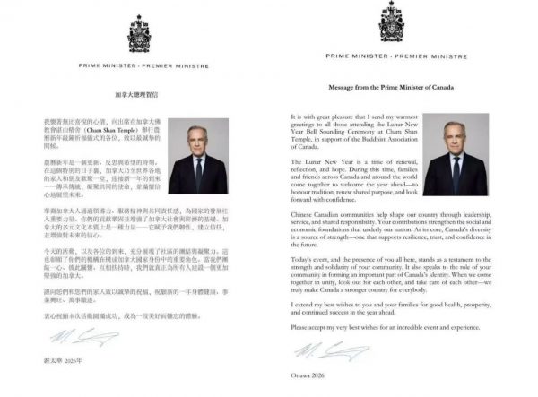 加拿大现任总理马克·卡尼(Mark Carney)特别发来的新春贺信,由联邦国会议员马荣铮宣读总理贺信,内容:“卡尼总理怀着无比喜悦的心情,向出席和支持在加拿大佛教会湛山精舍参加农历新年敲钟祈福仪式的各位,致以最诚挚的问候。